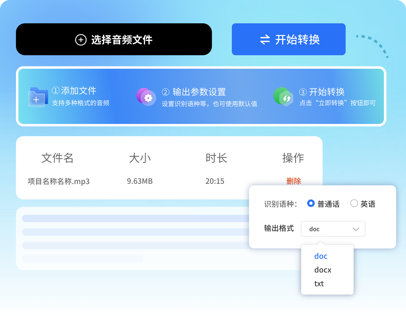高效识别,支持将语音音频文件快速转换为所需的文本文件
