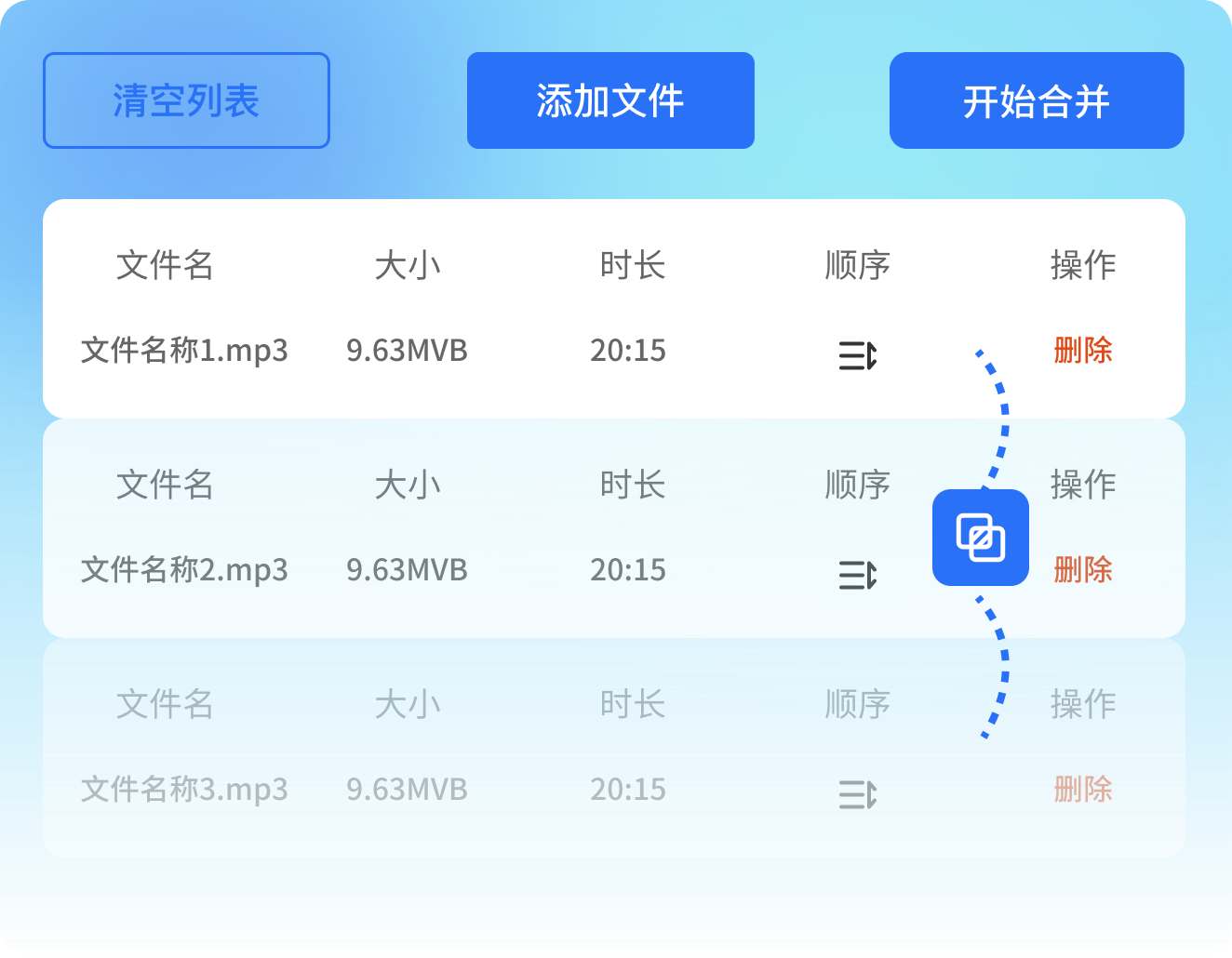支持多个音频上传,自定调节先后顺序,快速生成单音频文件